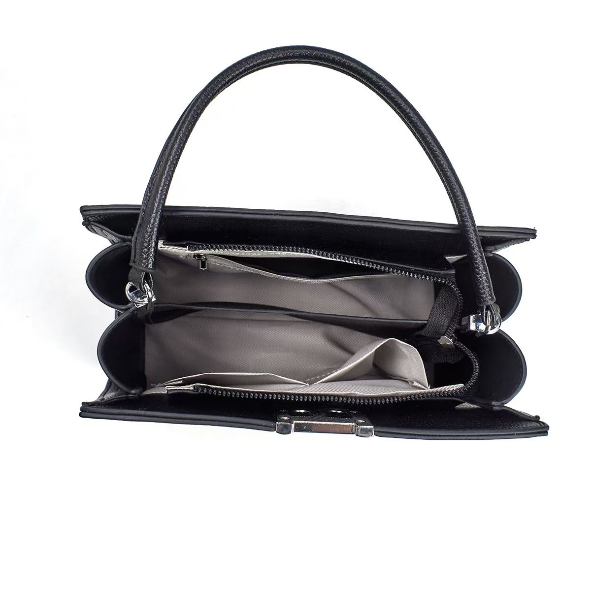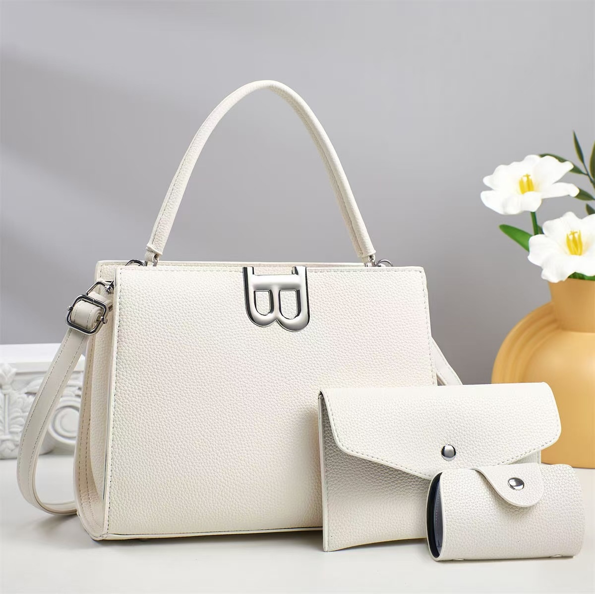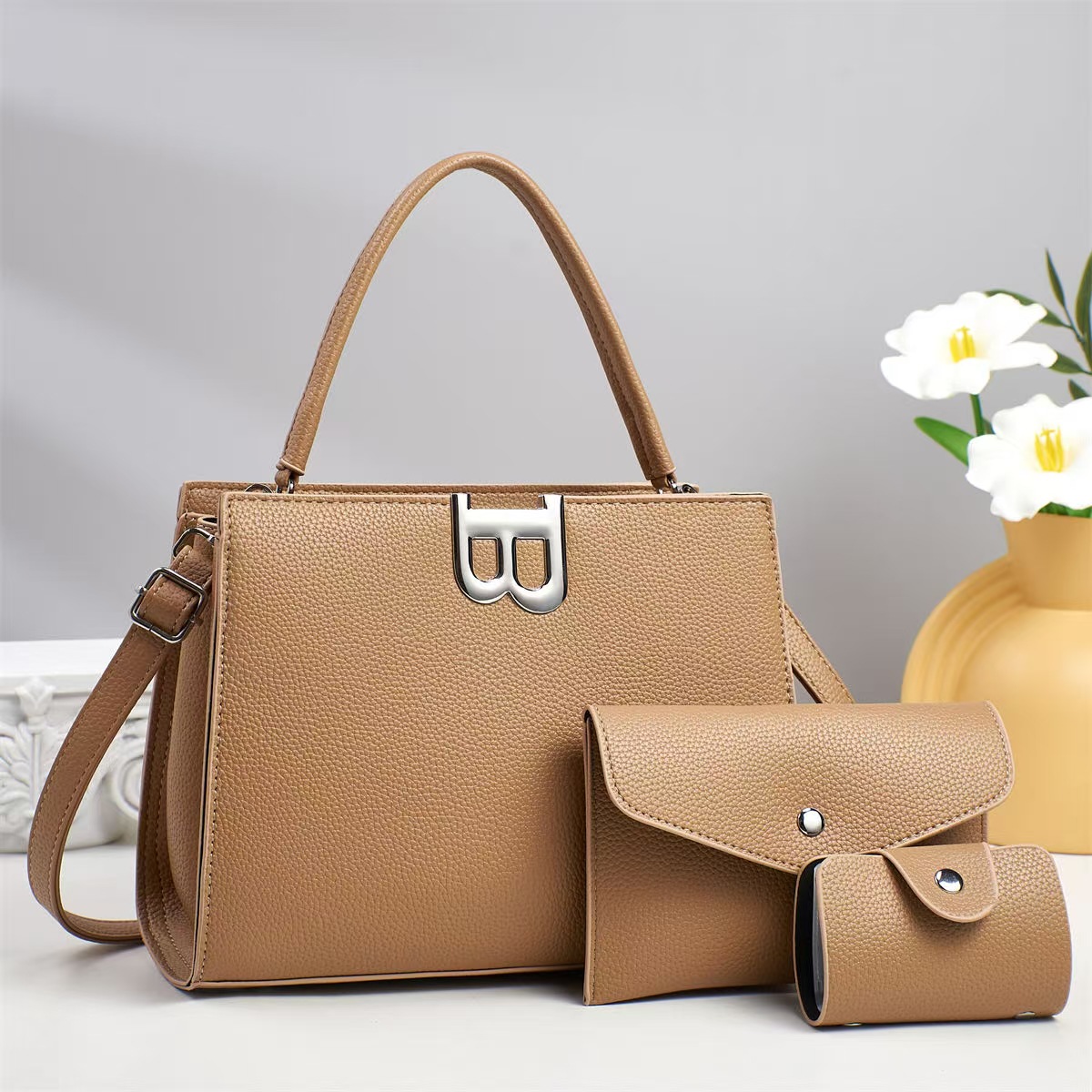 The Signature “B” Tote Set is designed for women who value polished detail and everyday practicality. Featuring a structured rectangular silhouette, distinctive metallic “B” clasp, and refined finishes, this set includes a matching wallet and pouch—making it a complete expression of luxury and organization.